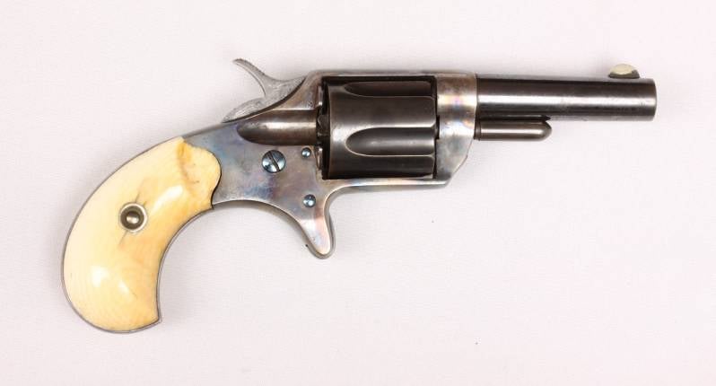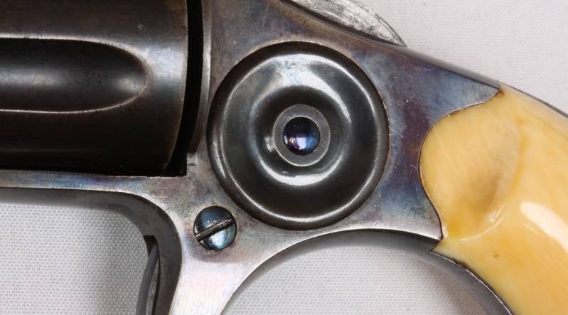 Voorbeeld van een buitengewone Colt New Line in .30 RF, waarvan er 11.000 zijn geproduceerd, grotendeels in nickel. Dit is een late (1876), met geblauwde loop en cilinder, case hardened frame, niter blue schroefjes en pin release button en originele ivoren grips. In deze configuratie kent dit exemplaar waarschijnlijk geen gelijke.
